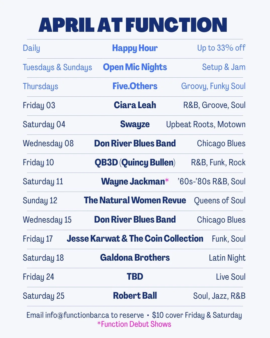 Welcome to Function Bar & Kitchen, where live music, craft drinks, and great company create unforgettable moments. From soul-stirring performances to open mic nights that spark new connections (and even new bands!), we’re all about bringing people together. Enjoy Toronto’s finest craft beer, a menu that caters to every taste—including vegetarian and gluten-free options—and a vibrant yet classy atmosphere that invites you to stay, sip, and savour the soul of the city.