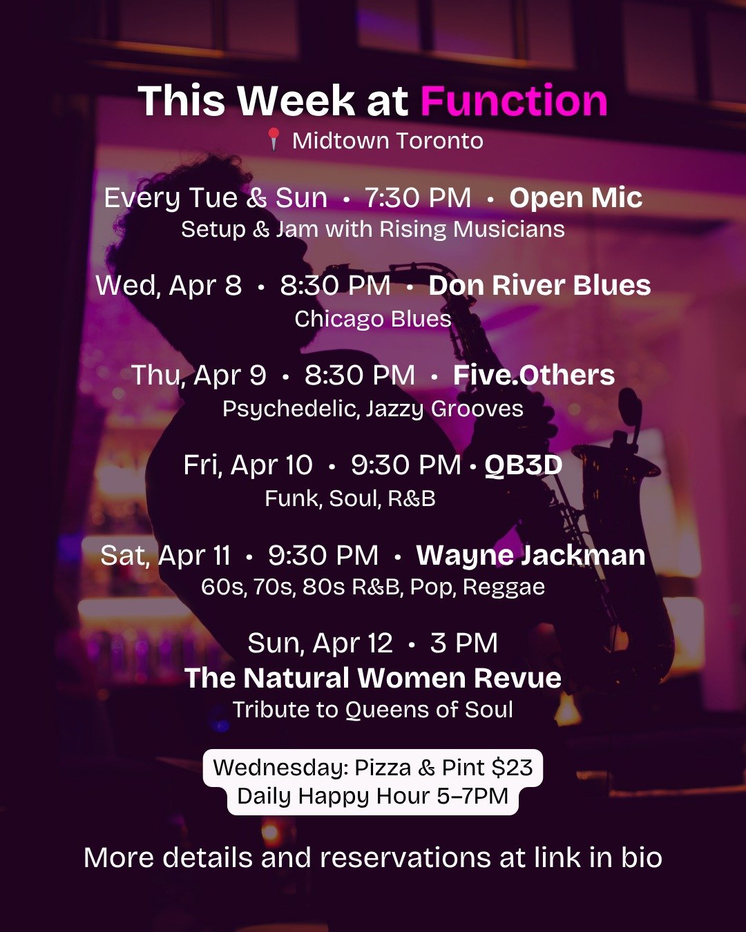 Check out our lineup of live music, from soulful jazz to upbeat R&B and everything in between. Plan your night and join us for unforgettable performances that bring Midtown Toronto to life.