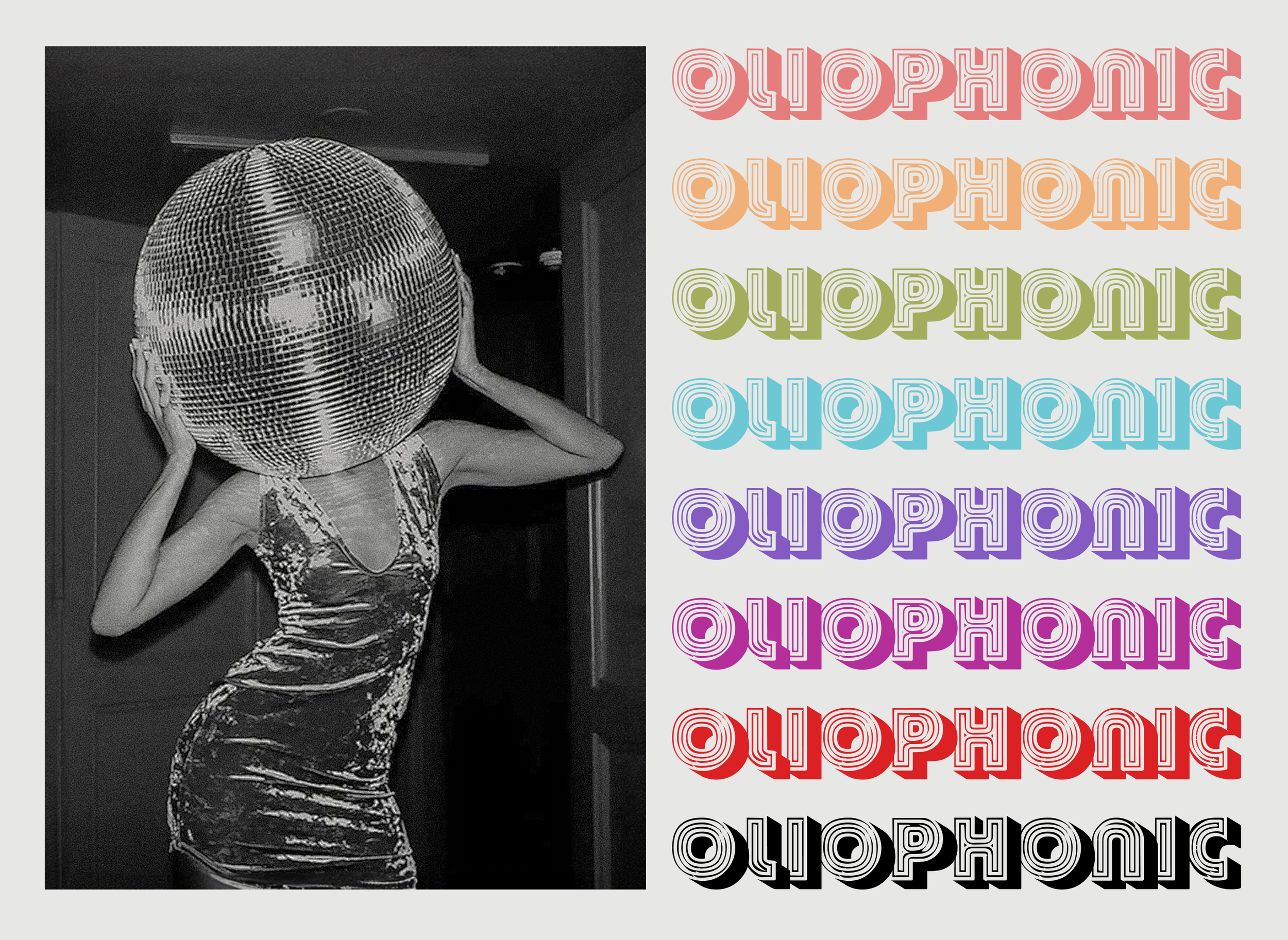 Oliophonic promo poster. A black and white photo of a female body in a velvet dress, with a large disco ball where her head should be :). To the right, “Oliophonic” typed out 8 times in various colours.